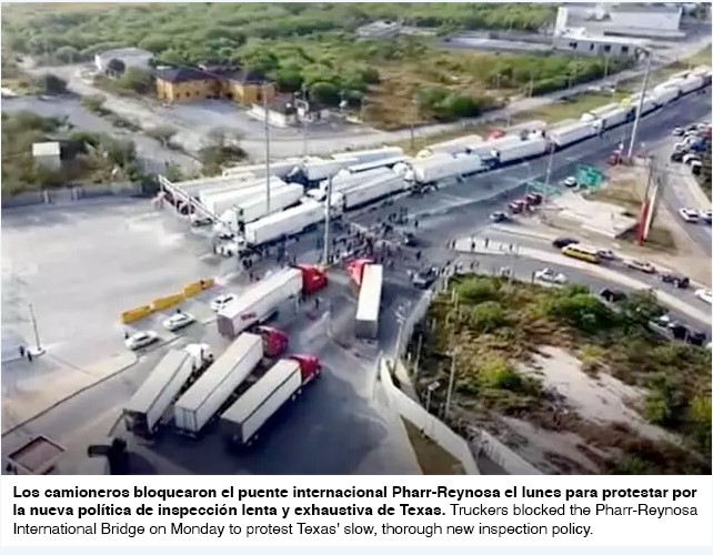 Los camioneros bloquearon un cruce internacional entre Tamaulipas y Texas el lunes para protestar por la política de inspección más estricta del Estado de la Estrella Solitaria para vehículos comerciales.