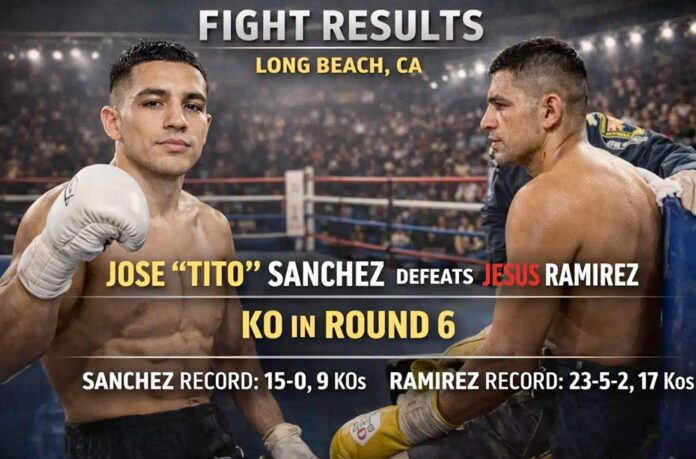 José “Tito” Sánchez returned from a long layoff looking sharp, stopping Jesús Ramírez in the sixth round at Thunder Studios in Long Beach. The end came 35 seconds into the frame, the result of steady pressure rather than reckless offense.