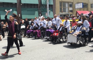 Severely weakened from nearly two weeks without food, the hunger strikers were helped into wheel chairs for the mile-long march and by volunteers from UCSF who pushed them along as they led the march to City Hall.